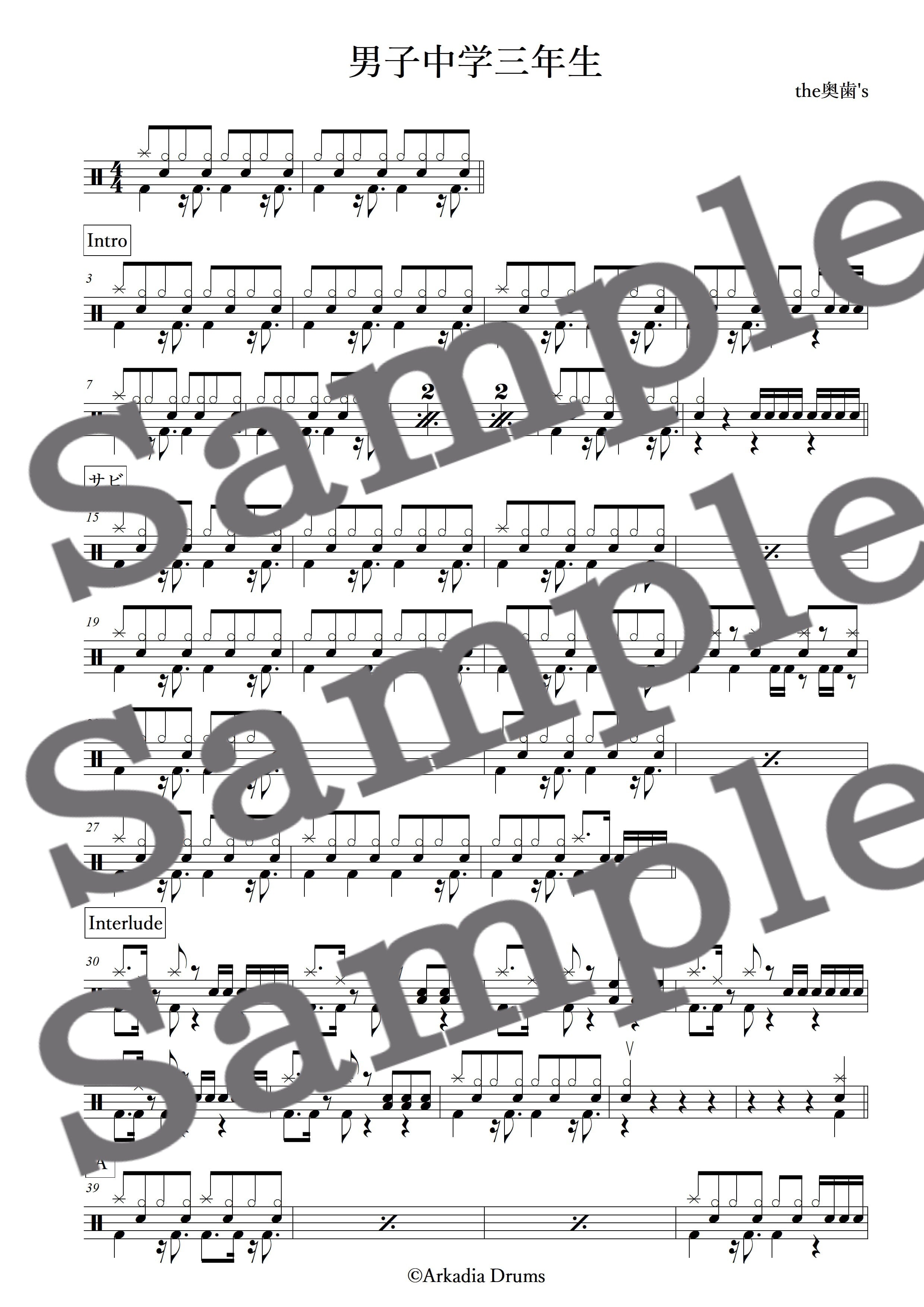 男子中学三年生(the奥歯's)のドラム楽譜です。
