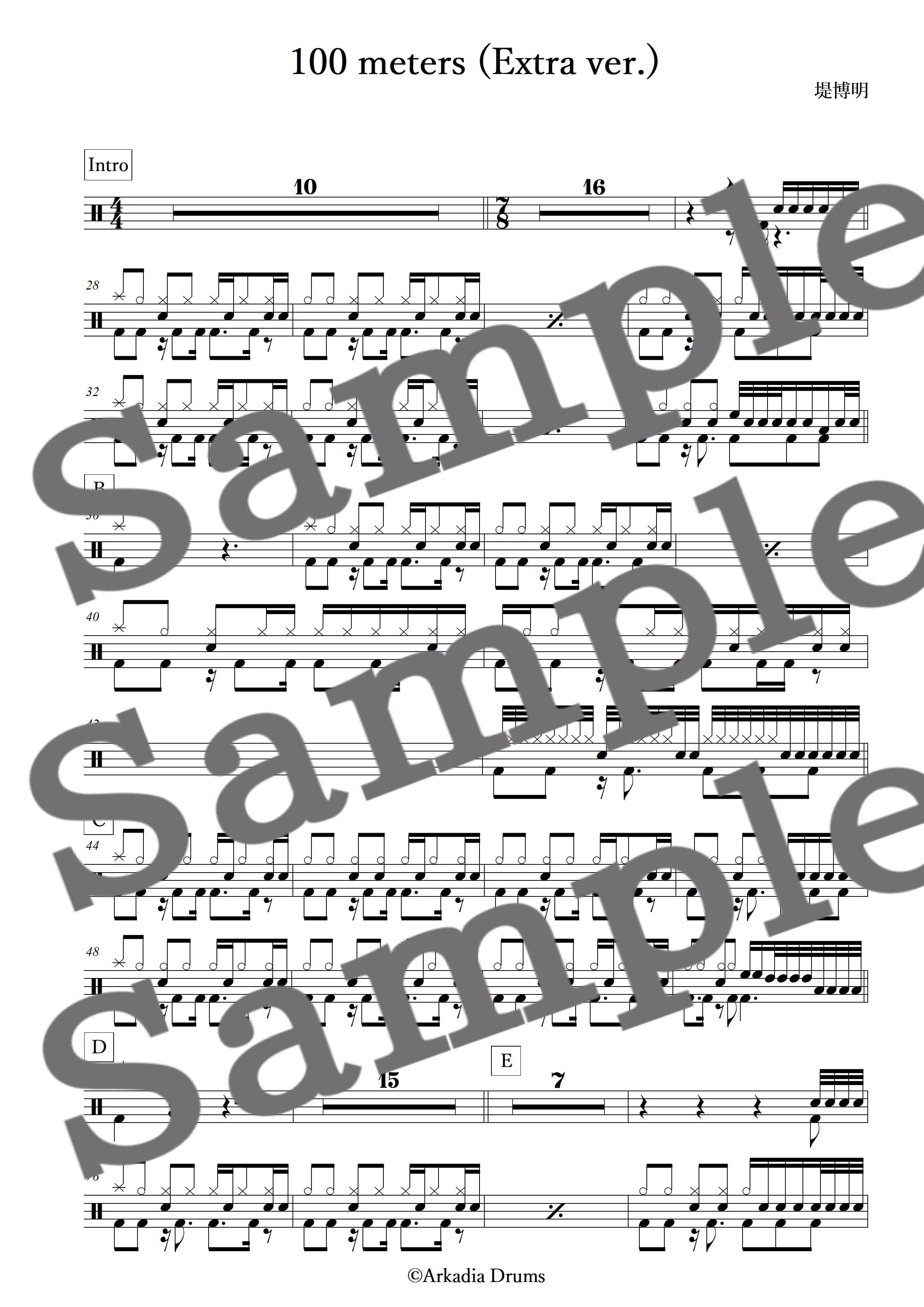 100 meters (Extra ver.)(堤博明)のドラム楽譜です。