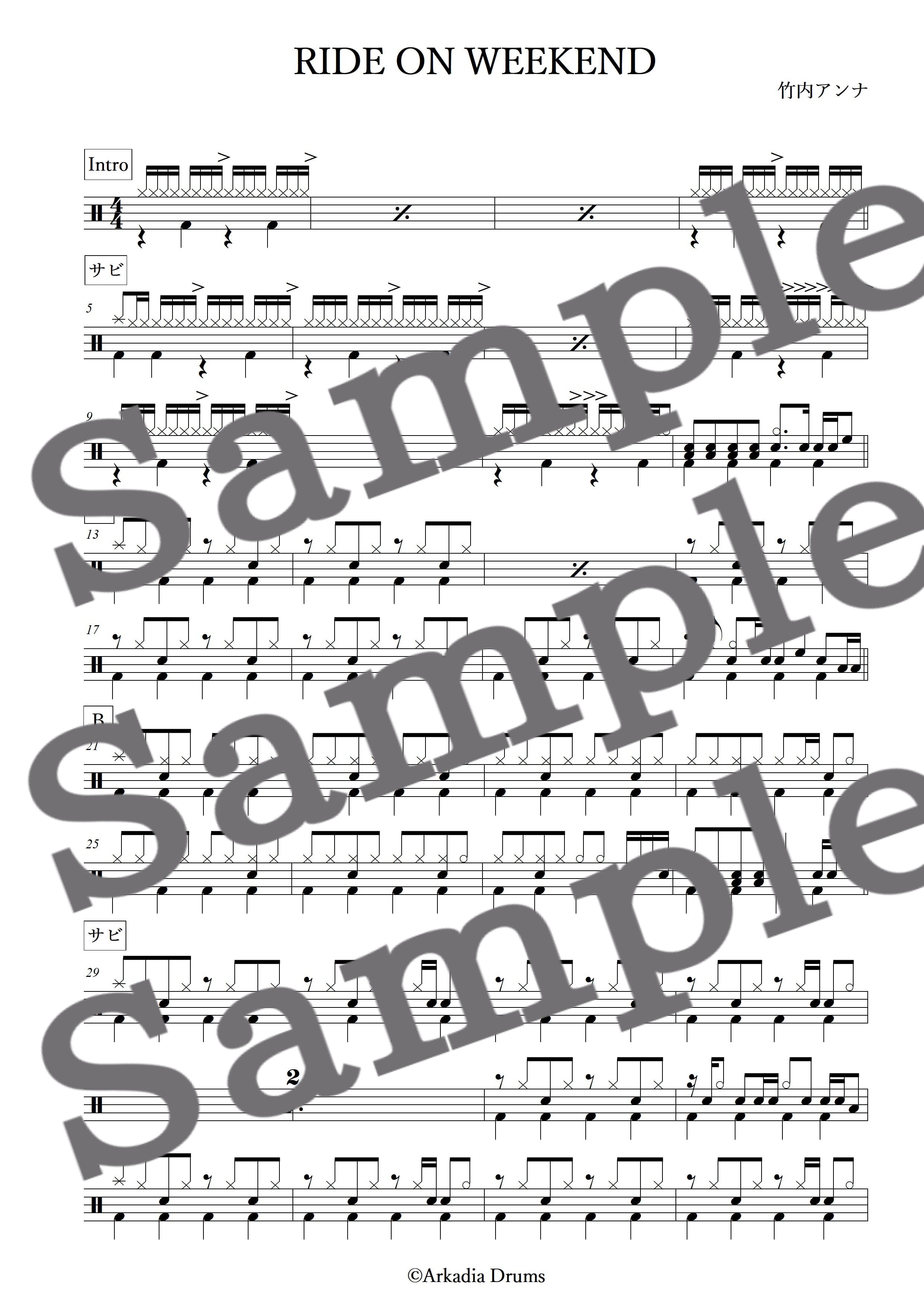 RIDE ON WEEKEND(竹内アンナ)のドラム楽譜です。