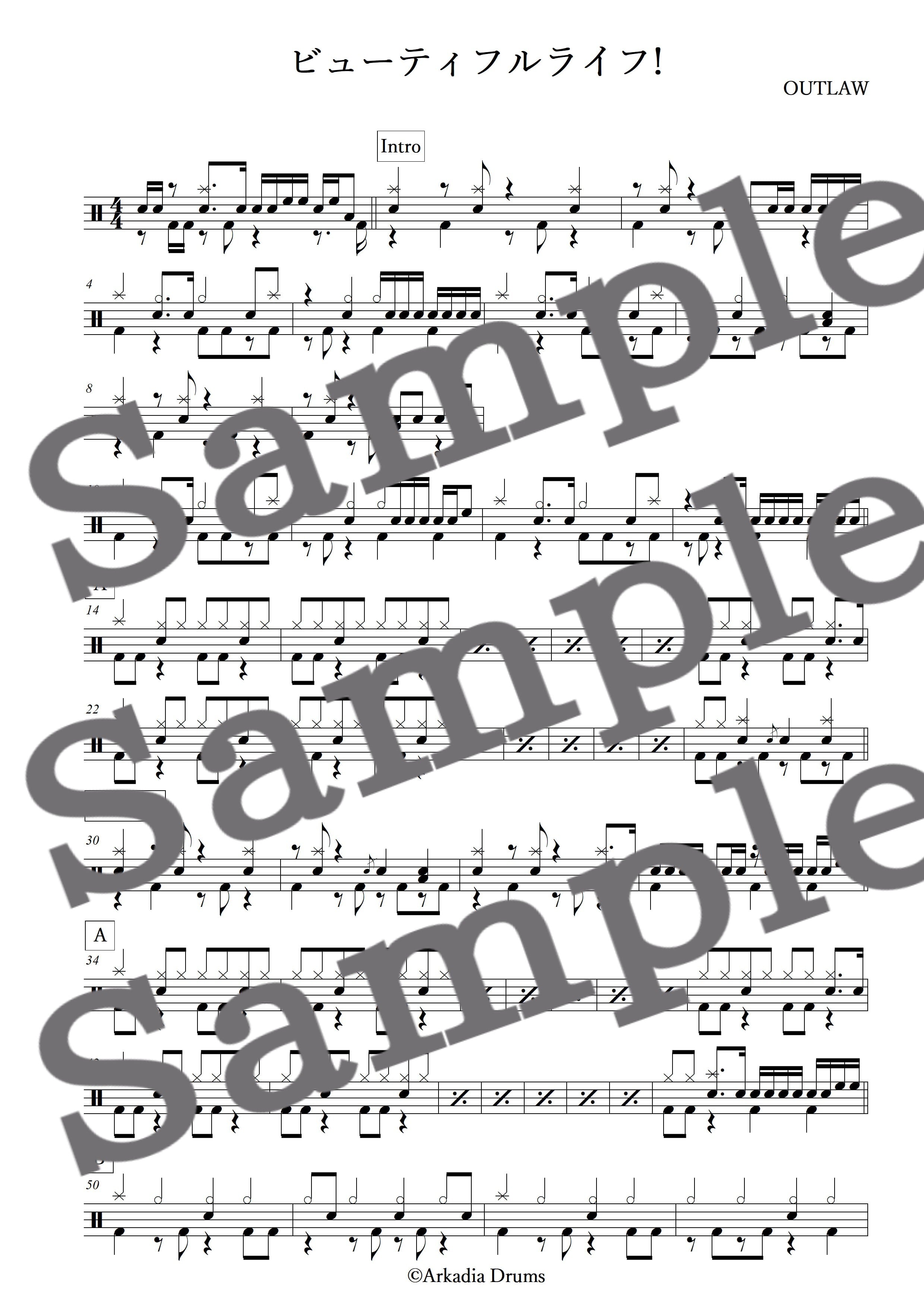 ビューティフルライフ!(OUTLAW)のドラム楽譜です。