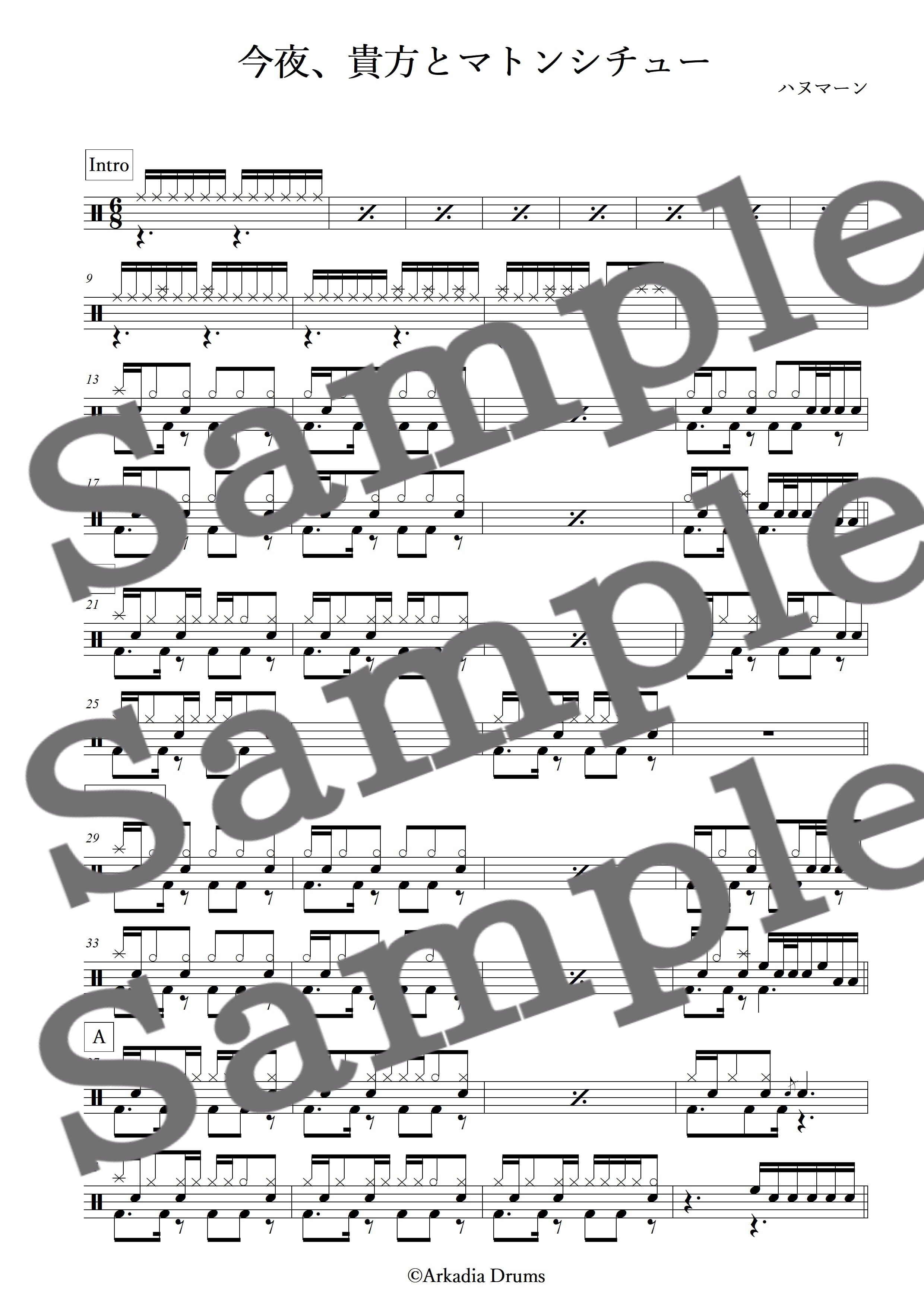 今夜、貴方とマトンシチュー(ハヌマーン)のドラム楽譜です。