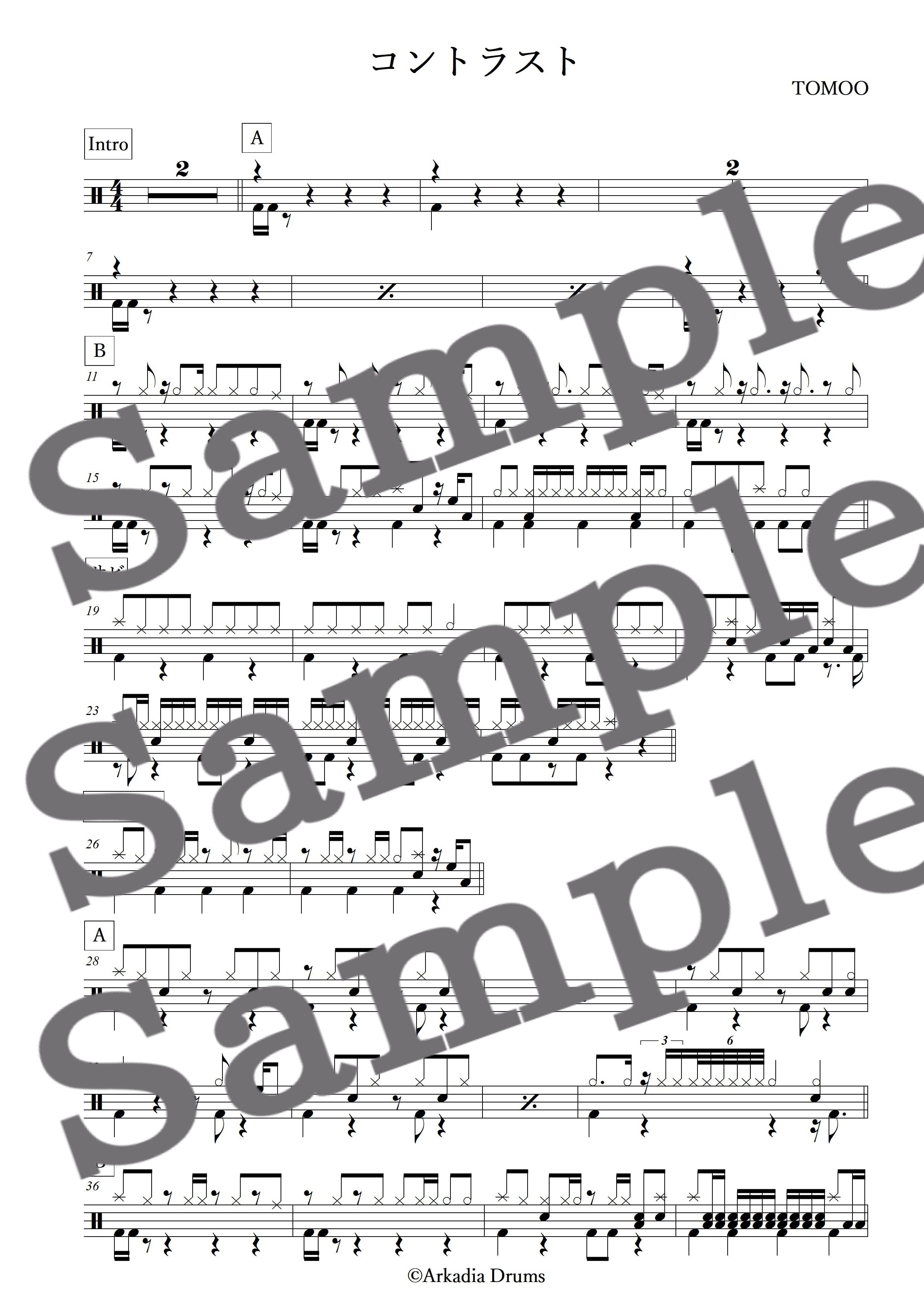 ドラムのみの楽譜であること、また大きめのセクションマークを配置しているので、演奏中でも迷いにくいのが特徴です。