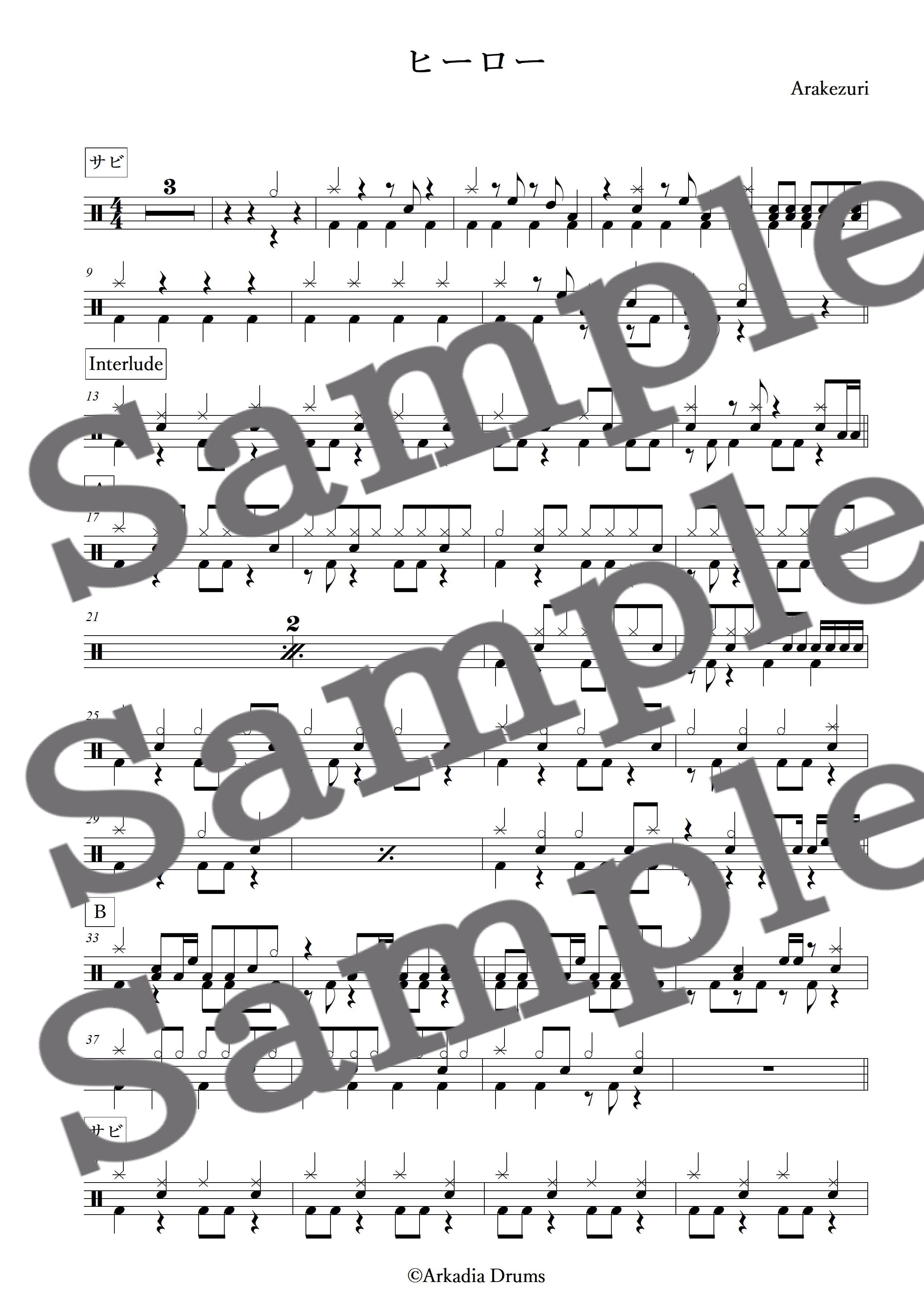 ヒーロー(Arakezuri)のドラム楽譜です。
