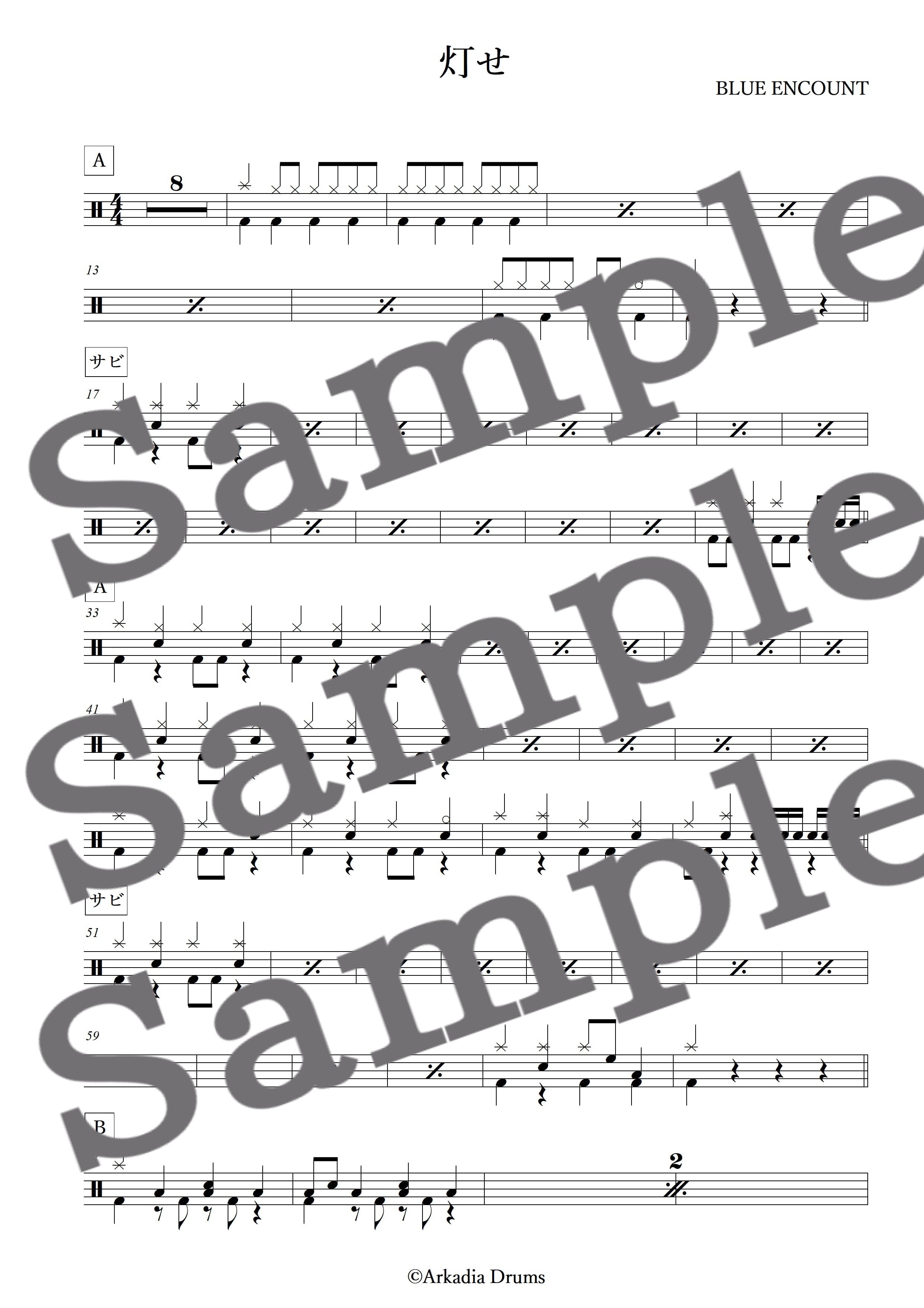 灯せ(BLUE ENCOUNT)のドラム楽譜です。