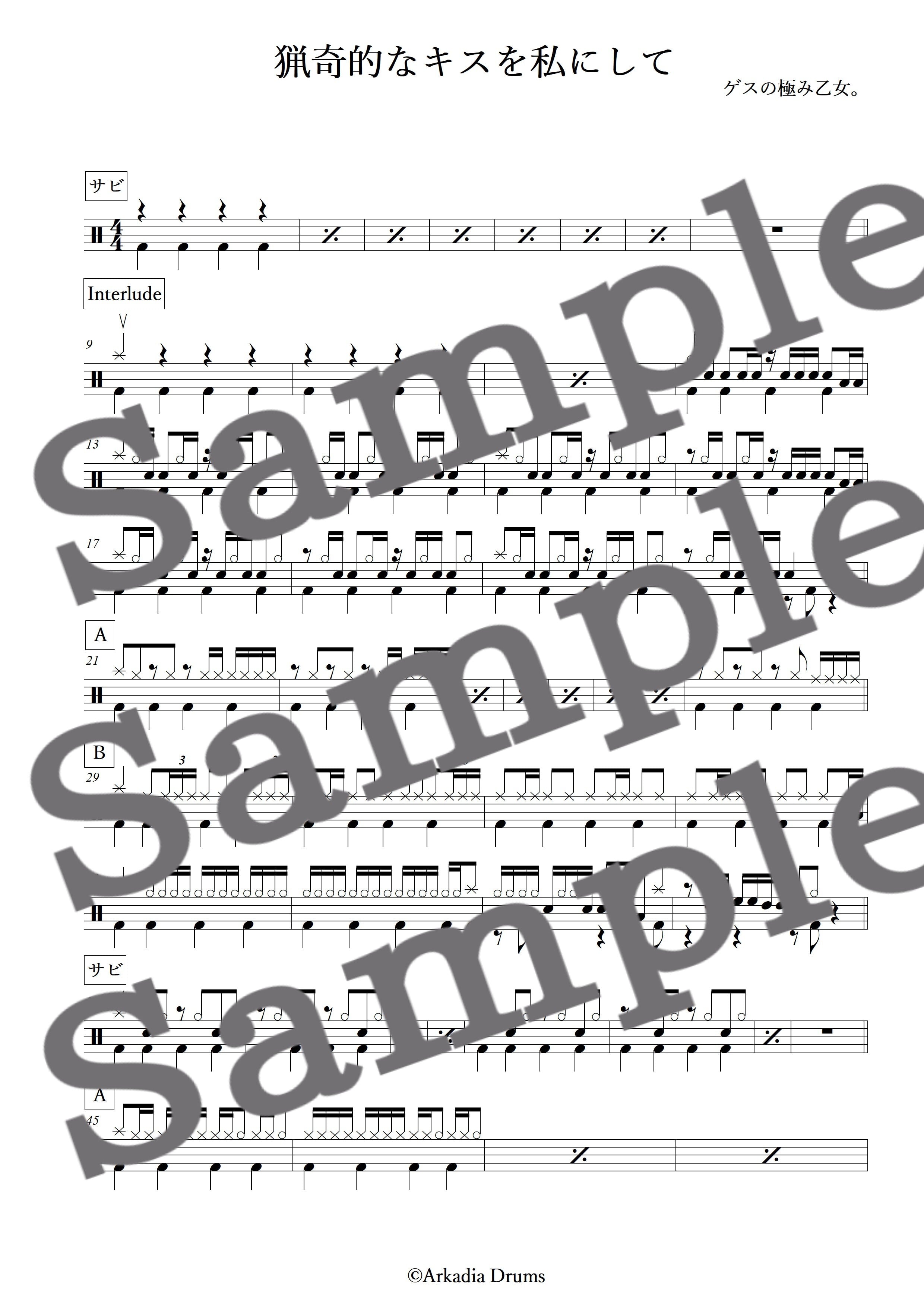 猟奇的なキスを私にして(ゲスの極み乙女。)のドラム楽譜です。