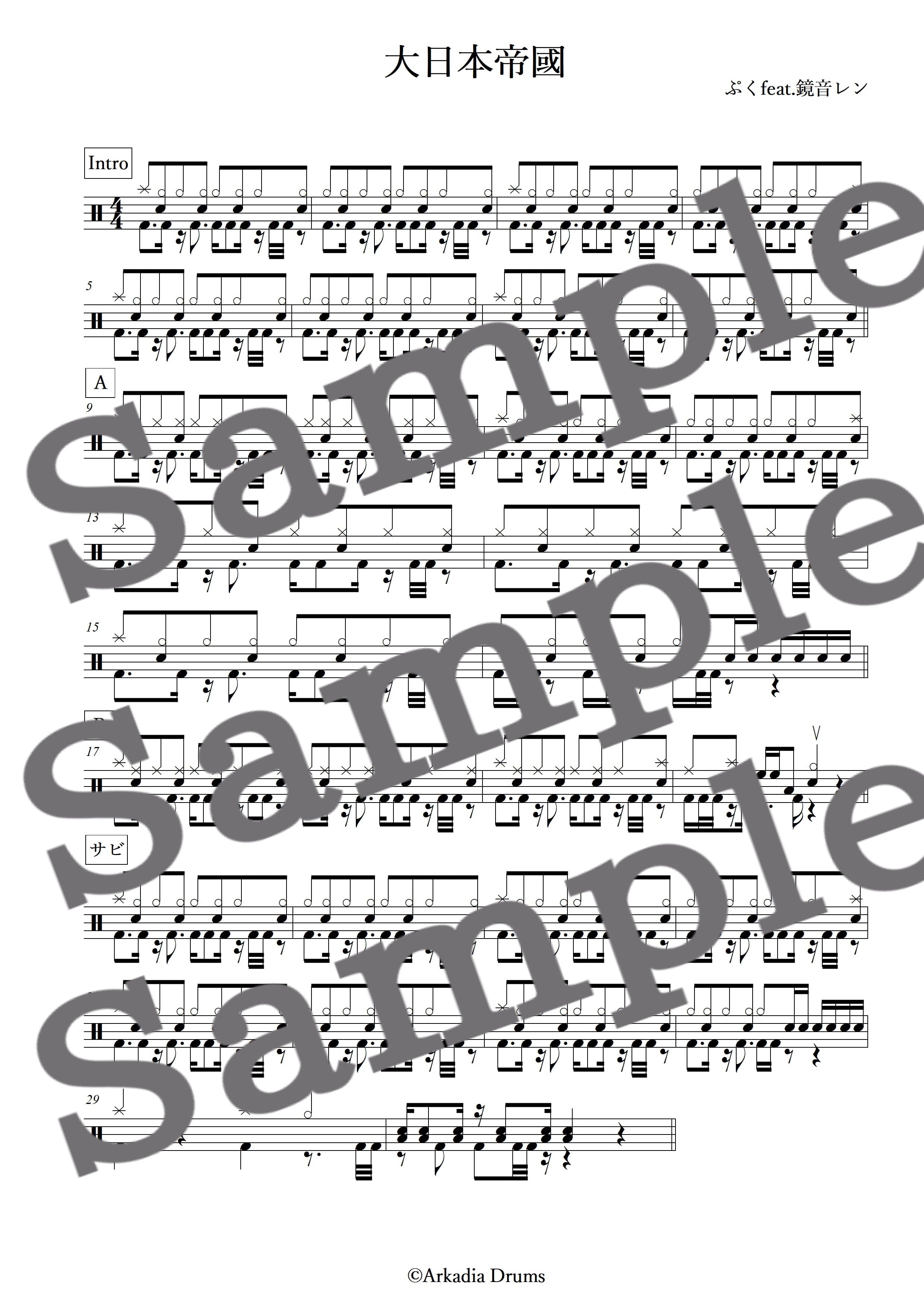 大日本帝國(ぷく feat. 鏡音レン)のドラム楽譜です。