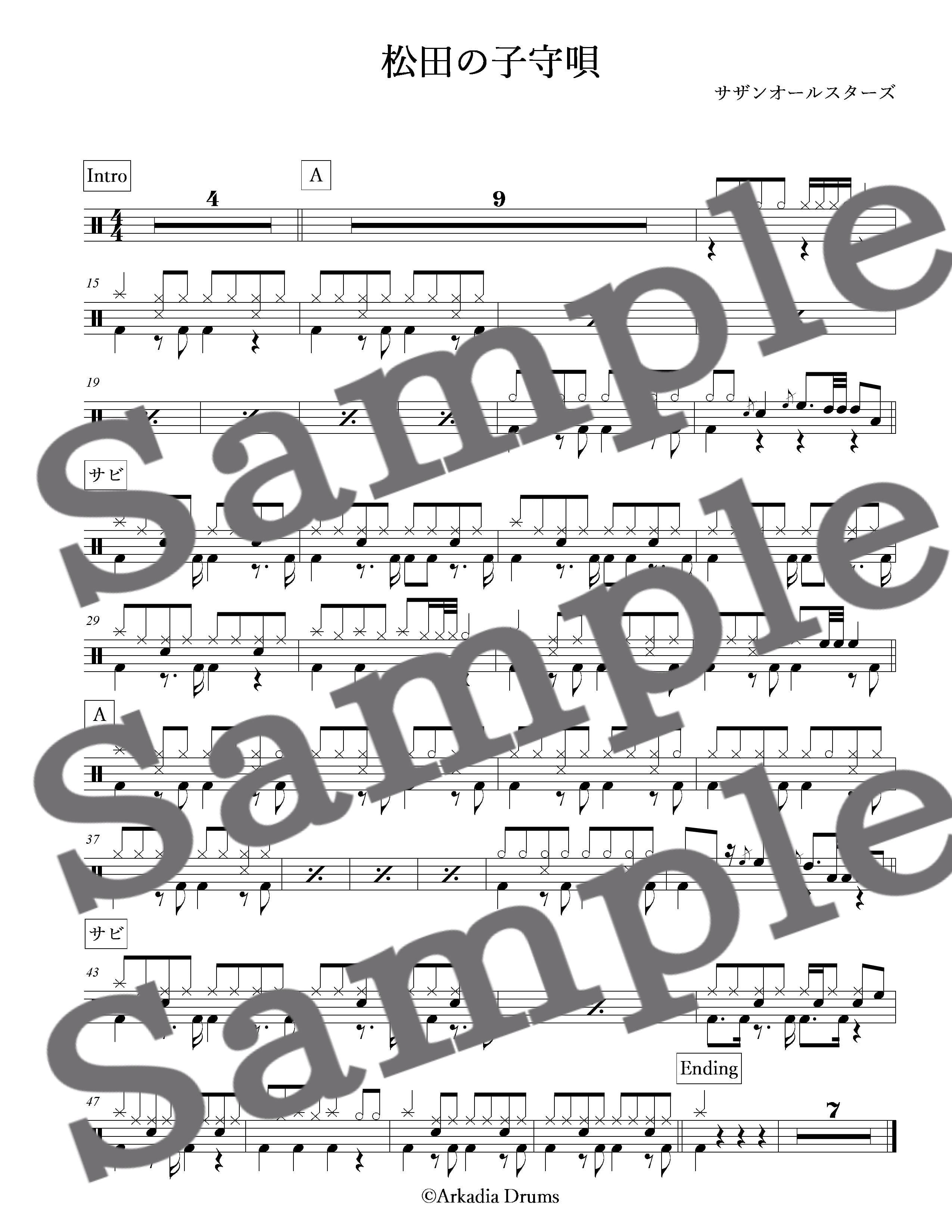 松田の子守唄(サザンオールスターズ)のドラム楽譜です。