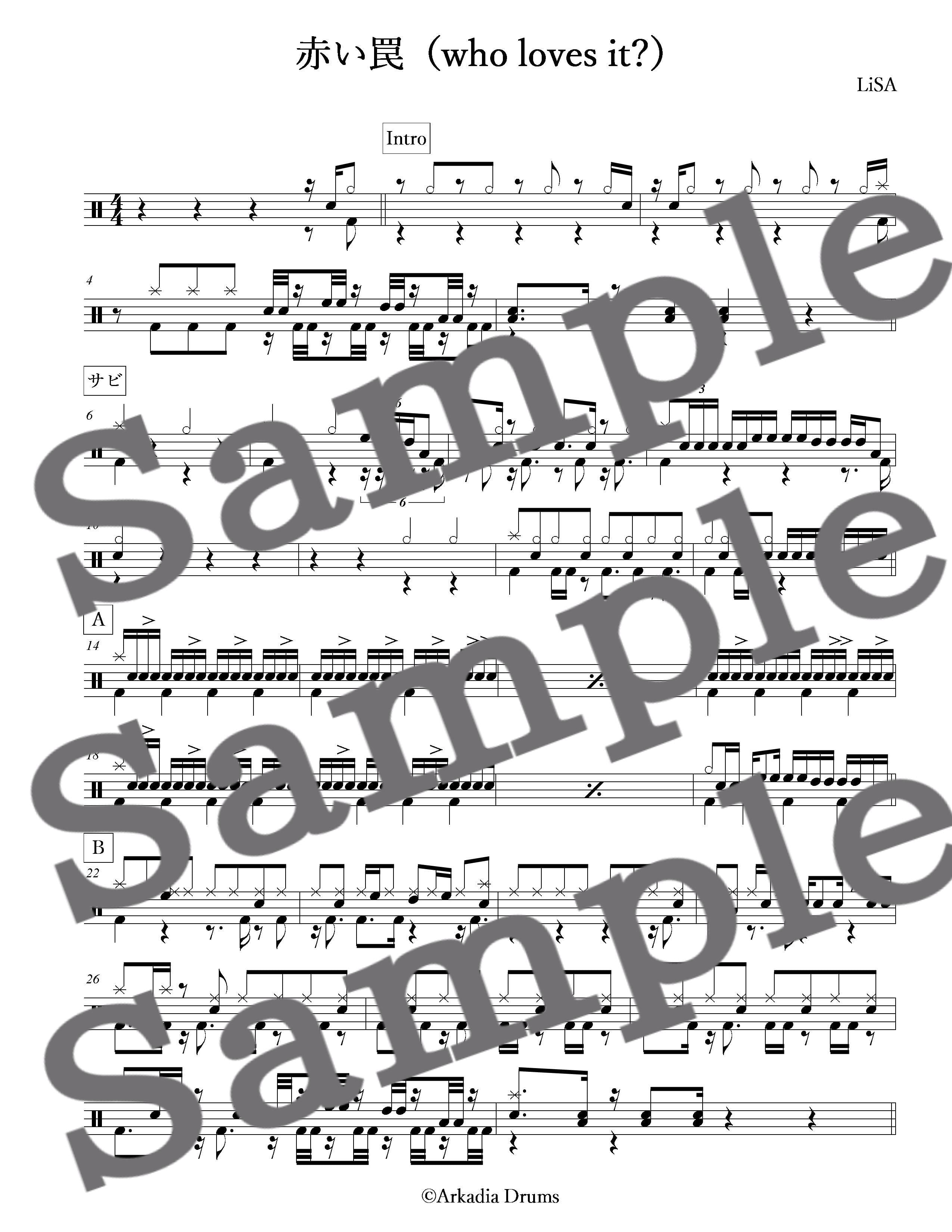 赤い罠(who loves it?)(LiSA)のドラム楽譜です。