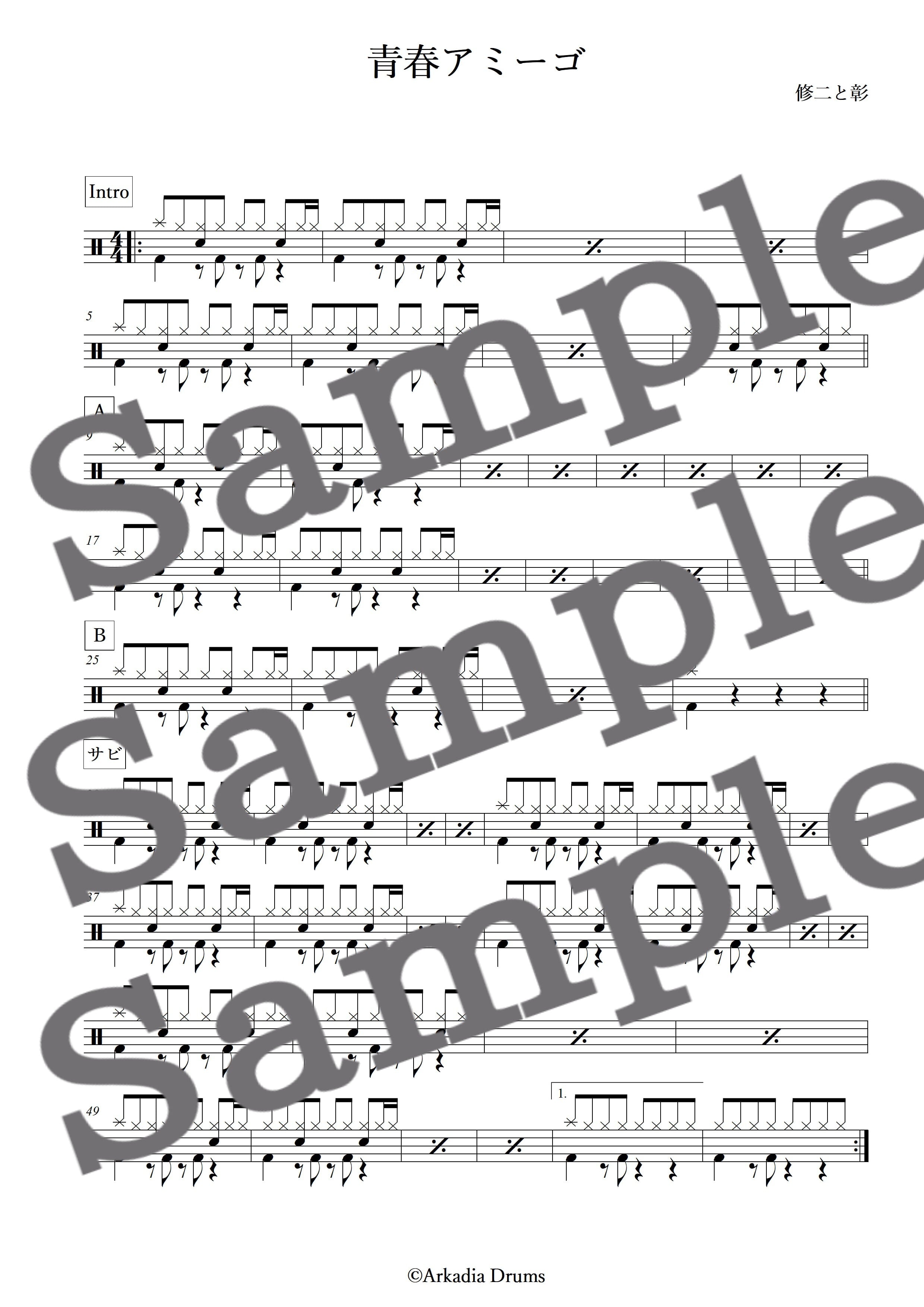 青春アミーゴ(修二と彰)のドラム楽譜です。