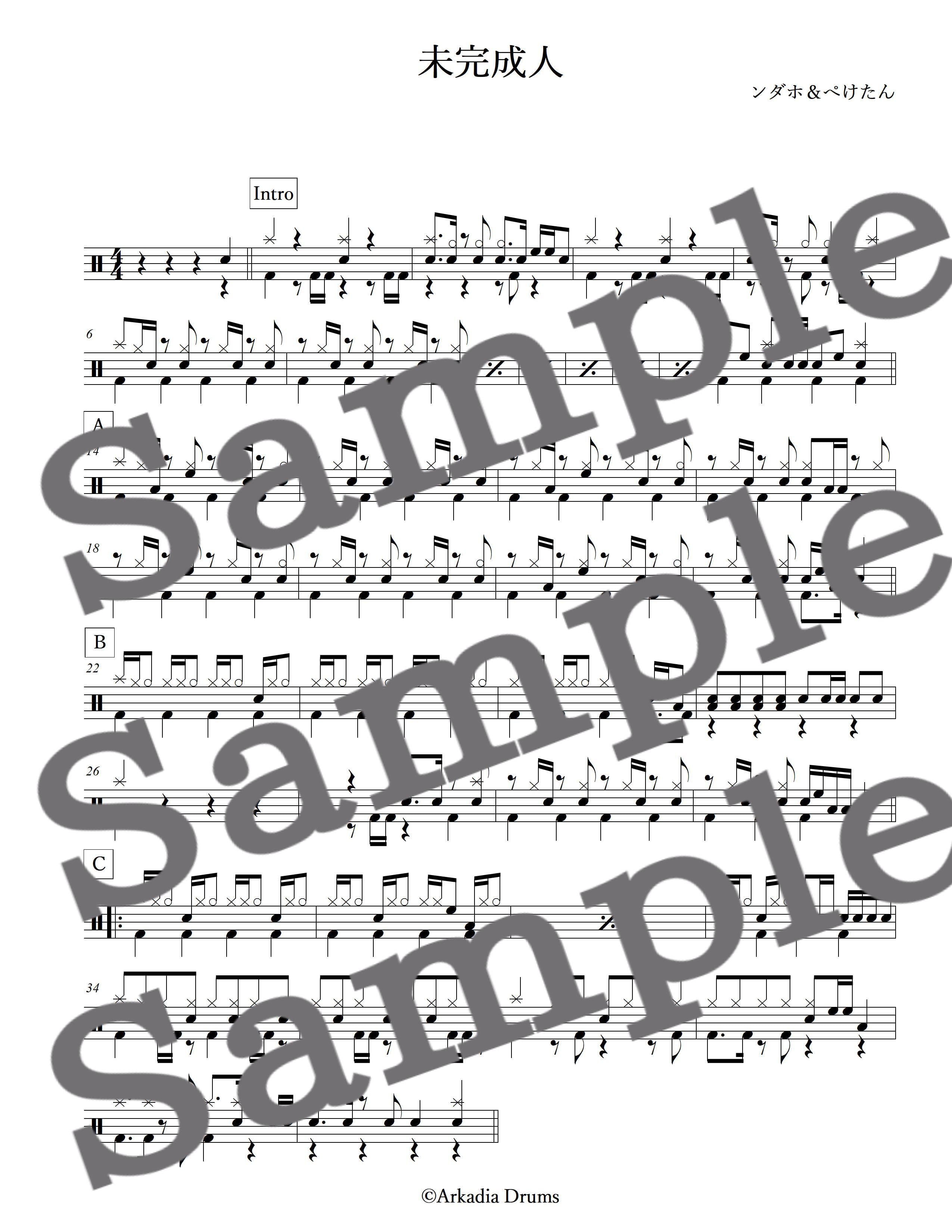 未完成人(ンダホ&ぺけたん)のドラム楽譜です。
