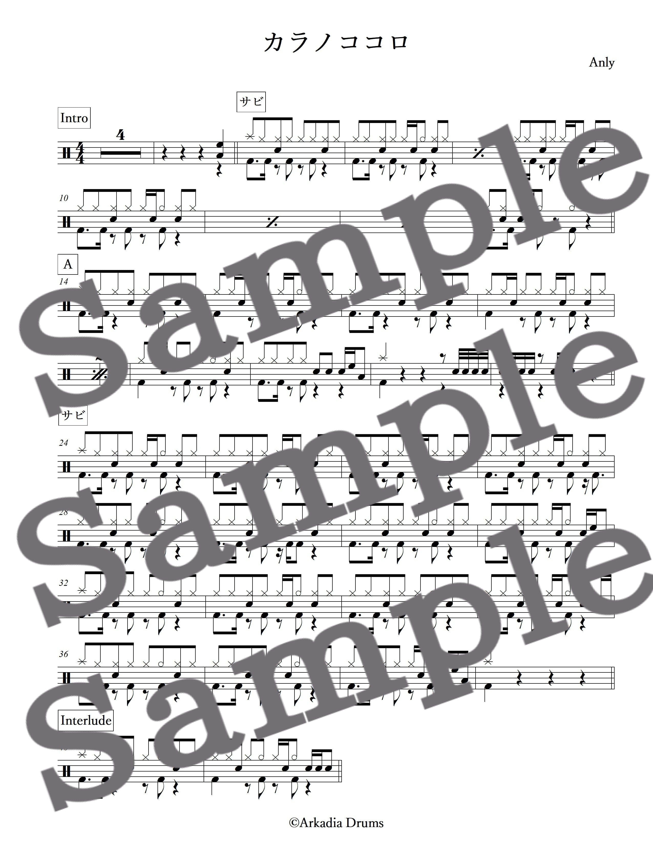 ドラムのみの楽譜であること、また大きめのセクションマークを配置しているので、演奏中でも迷いにくいのが特徴です。