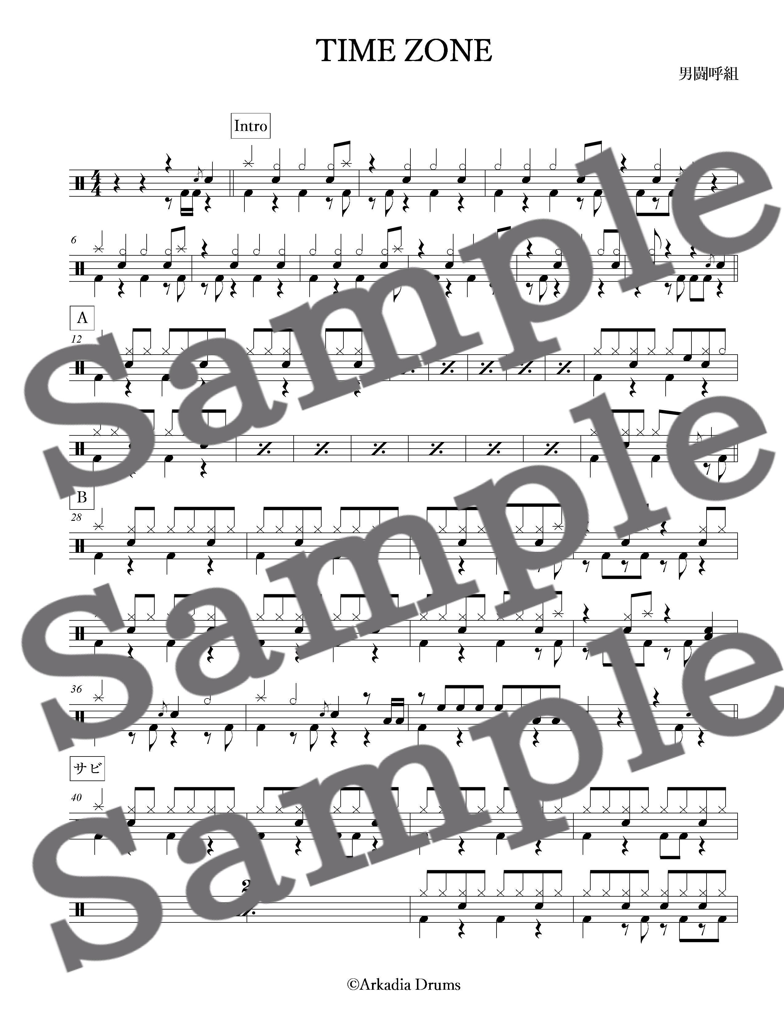 TIME ZONE(男闘呼組)のドラム楽譜です。