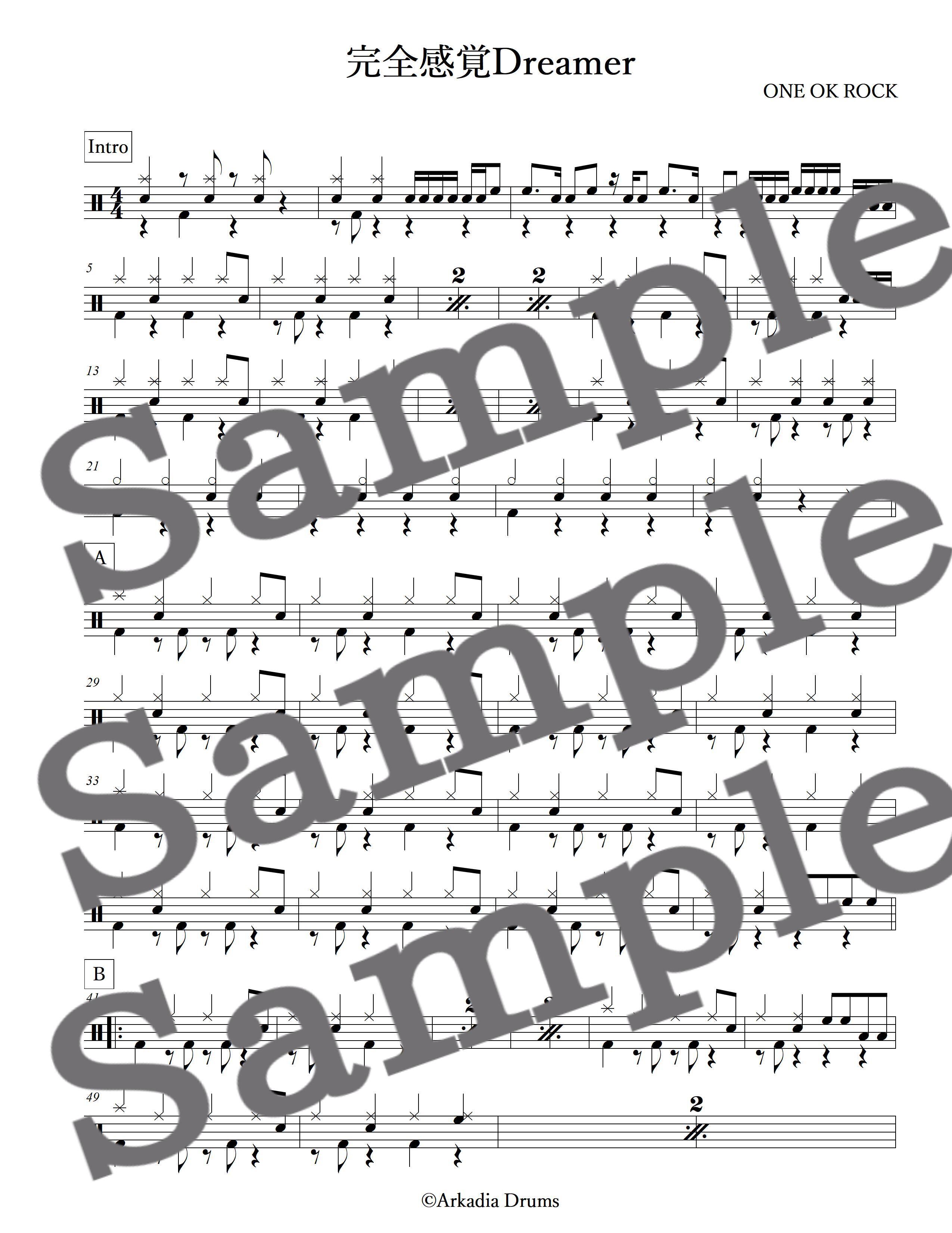 完全感覚Dreamer(ONE OK ROCK)簡単アレンジバージョンのドラム楽譜です。