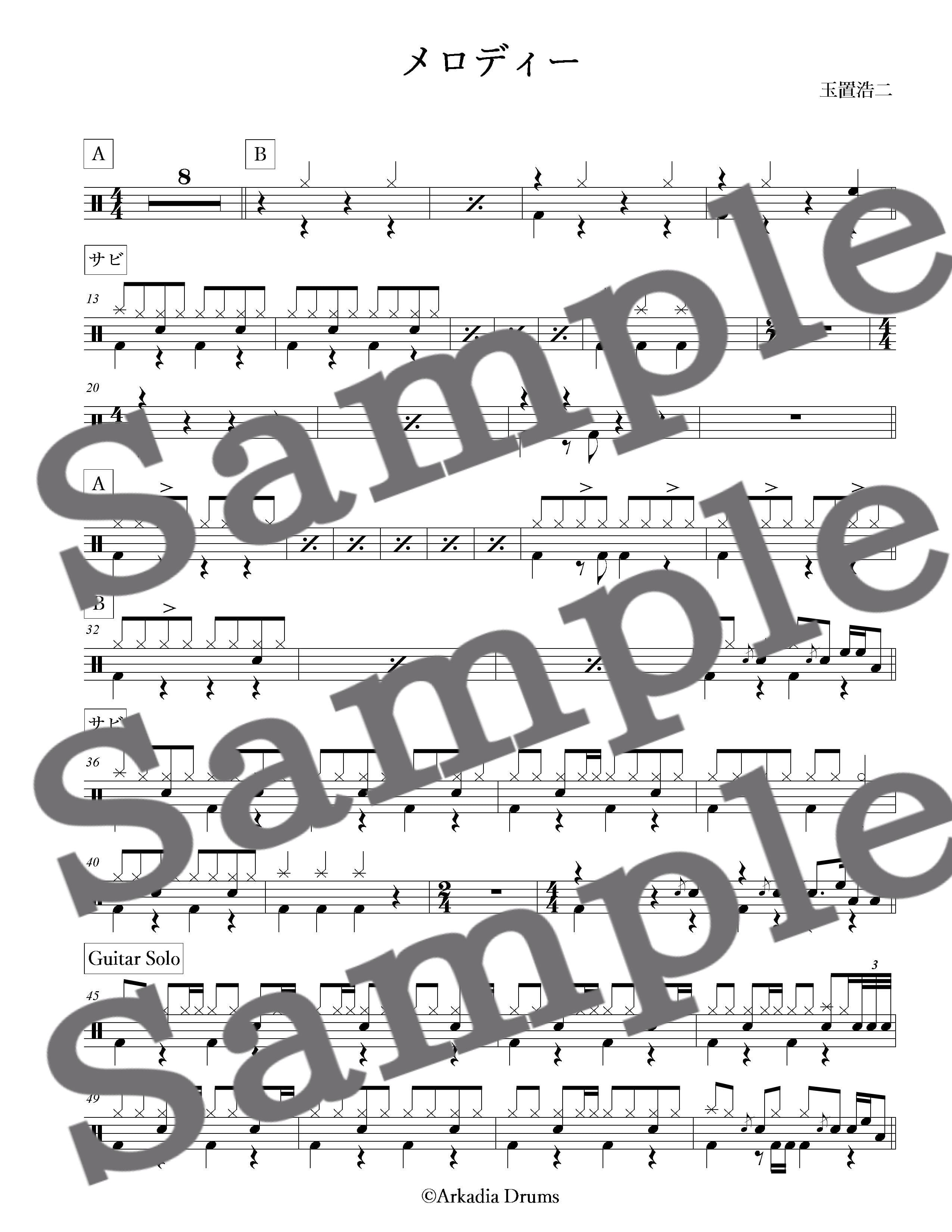ドラムのみの楽譜であること、また大きめのセクションマークを配置しているので、演奏中でも迷いにくいのが特徴です。